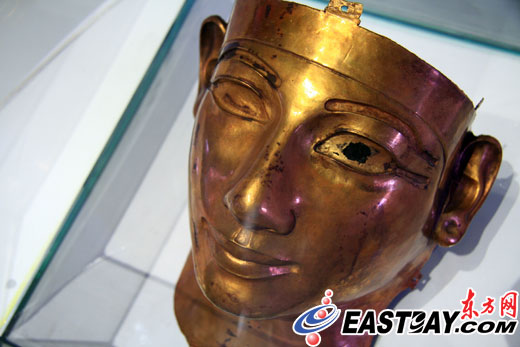 據(jù)介紹,“法老舍松契二世面具”誕生于公元前890年,在東尼羅河三角洲地帶被發(fā)現(xiàn)。黃金面具的左眼有一塊黑色,類似于眼珠,工作人員告訴東方網(wǎng)記者,可能是彩色涂料的殘留物,“這個面具的眼睛、眉毛等處在當時應該有被涂上彩色顏料!