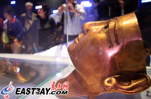 姍姍來遲的黃金制“法老舍松契二世面具”今天終于在世博會埃及館亮相。作為“鎮(zhèn)館之寶”的黃金法老面具被擺放在展館的最中央,吸引了大批游客駐足欣賞。