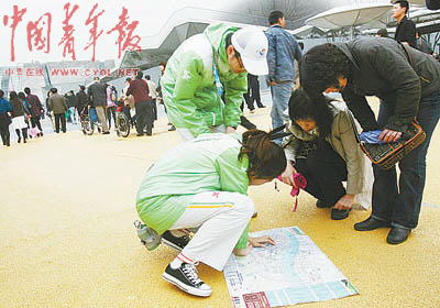 中國館南廣場(chǎng)上的30名首批志愿者都是來自復(fù)旦大學(xué)的學(xué)生。他們的工作在很多人看來很簡單,就是疏導(dǎo)游客,給游客指路。他們每天要重復(fù)幾萬次的回答就是:“對(duì)不起,預(yù)約券已經(jīng)發(fā)完了”,“您好,請(qǐng)往這邊走”……“現(xiàn)在我已經(jīng)不用看地圖就能清楚地給游客指路了。以前還不熟悉的時(shí)候,我利用休息的時(shí)間不斷地看地圖,已經(jīng)翻爛了兩份地圖,這是第三份了。”錢琲從包里翻開她的園區(qū)地圖,這一份也已經(jīng)快被她翻爛了,快斷裂的地方她用透明膠布粘著。