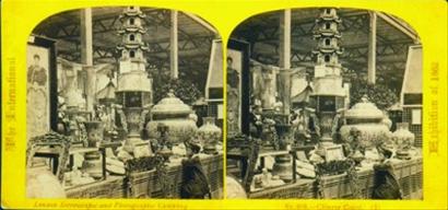 其中1862年倫敦世博會(huì)中國館立體照片,是迄今為止發(fā)現(xiàn)的世博會(huì)上有關(guān)中國館的最早的原版照片,彌足珍貴。照片由兩張一模一樣的正方形泛黃蛋白照組成。每張大小約在10厘米。底下一行英文小字顯示,照片由當(dāng)年的倫敦立體攝影公司制作完成。