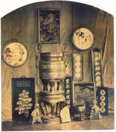 史料記載,1862年世博會(huì)上中國的參展規(guī)模很小,沒有單獨(dú)的展館,只是在主展廳內(nèi)有一個(gè)小小的展區(qū)展出一些陶瓷等中國土特產(chǎn)。照片印證了這一點(diǎn)。中國展示的有瓷器、佛像、琺瑯器、寶塔等,還有一張巨幅祖宗油畫。沒有獨(dú)立展館,但一個(gè)外國孩童正定睛觀看展品,初步顯示了東方藝術(shù)獨(dú)特魅力。