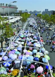 當(dāng)記者沿著世博軸緩步來到博成路高架步道下方的沙特館排隊區(qū)域入口時,時間已是9:25。入口處的沙特館工作人員手上的告示牌已經(jīng)寫著“沙特館排隊時間約8小時”,不少游客看到標(biāo)示后就放棄了排隊,但更多的游客選擇繼續(xù)堅持。已經(jīng)73歲的付老先生說:“之前就選定傳聞中很好看,但排隊時間長的沙特館作為世博游第一站,下定決心要把最難排到的場館先看掉!崩先耸虑耙褱(zhǔn)備好遮陽帽、攜帶式小椅、食物和水等物品,即使真要排9小時也要堅持下去。