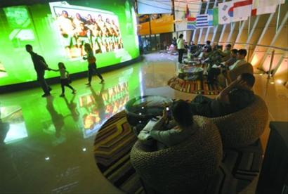 在展館中心,是一個(gè)木結(jié)構(gòu)的巨大金色球體。球內(nèi)有一個(gè)南非傳統(tǒng)手工藝展示回廊,金色球體外圍則是一個(gè)弧形視頻墻,不斷播放世界杯的宣傳短片,視頻墻的四周散落放置著各式藤椅,被設(shè)置成球迷酒吧。今晚,參觀者可以坐在這里,觀看南非迎戰(zhàn)墨西哥的首場(chǎng)比賽。屆時(shí),館內(nèi)的工作人員都會(huì)穿上南非國(guó)家隊(duì)隊(duì)服,為祖國(guó)的球隊(duì)加油。與其說南非館是一個(gè)展館倒不如說這里更像一個(gè)歡樂的大酒吧,而場(chǎng)館外面的鐵籠足球賽、桌面球賽等游戲,也讓游客們過一把足球癮。