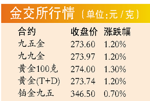 國(guó)內(nèi)主要現(xiàn)貨金品種Au99.95昨天漲3.32元,自7月29日的低點(diǎn)上漲約7.8%。國(guó)內(nèi)期金主力合約周三報(bào)收274.10元,創(chuàng)逾兩個(gè)月來新高。