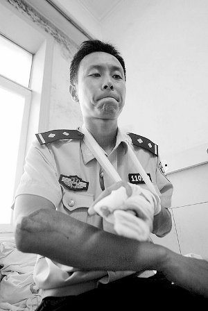 王梓的左手已經(jīng)被包扎上,紗布上面滲出很多鮮血。王梓的上肢到處都有很嚴重的擦皮傷,警褲多處已經(jīng)撕裂。