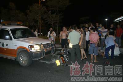 事發(fā)8月17日晚近10時(shí),黃先生說(shuō):“太突然了,我一下被撞飛,當(dāng)時(shí)馬上暈過(guò)去了。”當(dāng)晚,他和幾個(gè)同事在江濱路大排檔吃完飯后,分乘兩輛摩托車沿江濱路由東往西行駛,他開的摩托車上載著同事周女士。途經(jīng)洋老洲游泳池附近時(shí),黃先生突然感到后面有車撞來(lái),他和周女士被撞倒并被往前面推行了10多米,接著他就暈過(guò)去了。