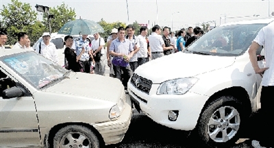“兩車相撞后,豐田車司機(jī)跳下來,大聲對(duì)我說,他在洛陽(yáng)報(bào)警多次,說他家里有毒品,可洛陽(yáng)警方一直不理他。他跑到鄭州,找公安廳找不到,就在這里撞車!