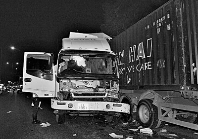 中新網(wǎng)7月9日電 據(jù)香港文匯報報道,香港屯門公路8日凌晨發(fā)生嚴(yán)重車禍。一輛密斗貨車疑在路面左穿右插失事,狂撼前面一輛貨柜車車尾,致?lián)躏L(fēng)玻璃甩脫;前座司機(jī)妻子疑沒有佩戴安全帶,如炮彈般從車頭飛出車外,再被密斗貨車卷入車底,左臂被車輪輾壓重傷。