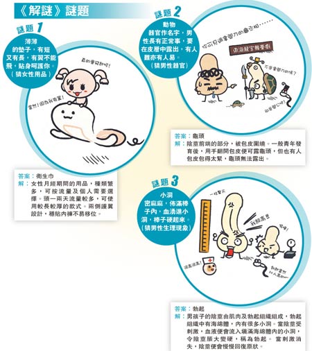 負責策劃《解謎》的家計會教育干事陳耀杰表示,《解謎》的版面設計十分可愛,從封面到內頁都輔以不少生動的漫畫,希望吸引小朋友閱讀,該書采一問一答形式,方便家長和教師與小朋友打開話題,輕松無尷尬地談性,“家長可先猜猜謎,由謎語游戲開始,玩一會才向子女灌輸性教育”。
