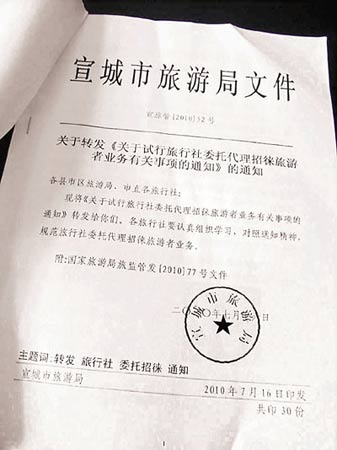 記者向當(dāng)?shù)芈糜螛I(yè)界人士了解了一些情況,據(jù)說整個(gè)宣城市,包括涇縣在內(nèi),沒有一家旅行社具備組織出境游的資格。當(dāng)?shù)芈眯猩缱疃酁楹戏、南京等地旅行社做代理攬客的業(yè)務(wù)。