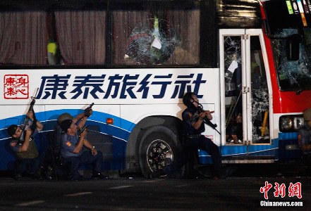 特警把旅游巴士團(tuán)團(tuán)包圍,警察曾把后擋風(fēng)玻璃打碎,并試圖強(qiáng)攻旅游巴士。至晚上接近9時(shí),槍手被擊斃后,巴士?jī)?nèi)的幸存者才陸續(xù)被救出來(lái)。