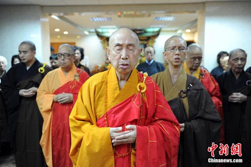 下午2時(shí)許,港島灣仔的香港佛教聯(lián)合會(huì)的會(huì)場,會(huì)長覺光長老主持拈香。他身后還有智慧法師、紹根法師、融靈法師等會(huì)內(nèi)長老,都內(nèi)穿黃色衣衫,外披紅色水田格袈裟。兩側(cè)恭敬站立著近30位佛教居士,著黑色海青和褐色袈裟。