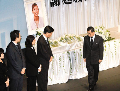 為表敬意,劇院內(nèi)的紅色椅子鋪上白布,禮臺擺放謝廷駿生前一張展露燦爛笑容的照片,旁邊豎立一個(gè)鮮花砌成的心形花牌,臺前則擺放香檳色玫瑰花束。追思會(huì)開始后,先為謝廷駿默哀1分鐘,寂靜的空氣和悄悄爬到各人臉上的淚珠,猶如寄托無限綿長的哀思,向另一國度的謝廷駿致敬。其后,大會(huì)播放謝廷駿生前的照片,襯以他生前最愛的歌曲《海闊天空》作背景音樂,謝廷駿部分好友、同事及瑜伽教練隨后輪流上臺,思憶著跟謝廷駿相處的點(diǎn)滴,淚水再度灑下……