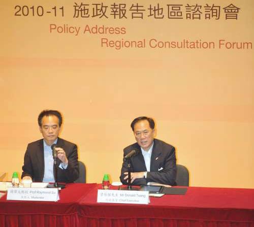 特區(qū)政府已分批約見(jiàn)多個(gè)政黨和團(tuán)體,咨詢市民對(duì)施政報(bào)告的意見(jiàn)。首場(chǎng)咨詢會(huì)在科學(xué)館舉行,約有來(lái)自各區(qū)200名市民出席,但只有十多人向曾蔭權(quán)提問(wèn),大部人均關(guān)注民生議題,包括復(fù)建居屋的訴求。曾蔭權(quán)在開(kāi)場(chǎng)白中表示,希望透過(guò)咨詢會(huì)聆聽(tīng)大家在生活、學(xué)習(xí)、就業(yè)、營(yíng)商等各方面的意見(jiàn)、憂慮和建議。他將在一周后動(dòng)筆,希望在下月13日發(fā)表的《施政報(bào)告》能夠反映出各方面的意見(jiàn)。