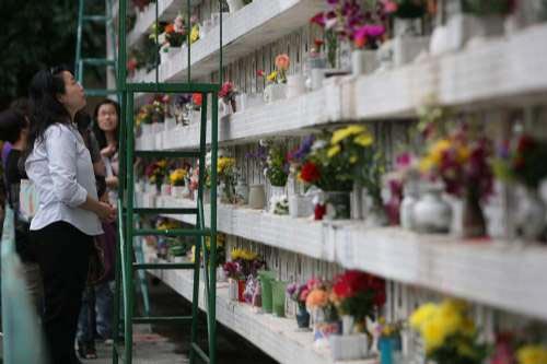 先人輪候公營骨灰龕位遙遙無期,紅磡一帶多間長生店,16日有不少市民扶老攜幼,帶同祭品前往拜祭先人。有市民在閣樓拜祭,有市民在馬路邊燃燒冥鏹。