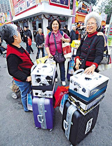 來自廣州的楊小姐和潘婆婆,每年工展會(huì)都會(huì)專程來港購物。兩人不消五分鐘,便各買一個(gè)價(jià)值近二千元的煲,個(gè)半小時(shí)內(nèi)兩人消費(fèi)逾萬元,現(xiàn)金不夠也毋須怕,“刷卡啦!”
