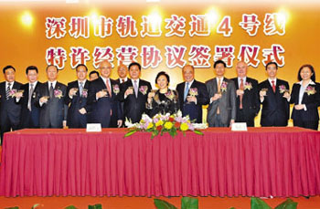 在18日的簽署儀式上,港鐵行政總裁周松崗與深圳市發(fā)展和改革局、交通局、國(guó)資委負(fù)責(zé)人先后簽署《深圳市軌道交通四號(hào)線特許經(jīng)營(yíng)協(xié)議》、《深圳市軌道交通四號(hào)線建設(shè)標(biāo)準(zhǔn)及運(yùn)營(yíng)期滿后移交標(biāo)準(zhǔn)之協(xié)議》、《深圳市軌道交通四號(hào)線運(yùn)營(yíng)協(xié)議》、《深圳市軌道交通四號(hào)線一期設(shè)施租賃協(xié)議》共四份協(xié)議。