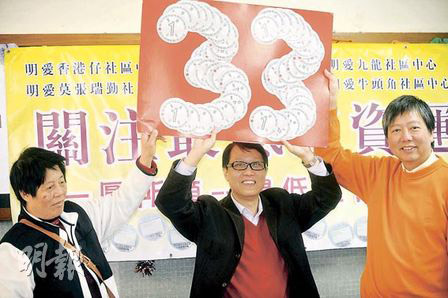 中新網(wǎng)1月18日電 香港立法會(huì)現(xiàn)正審議最低工資條例草案,而臨時(shí)最低工資委員會(huì)正研究法定最低工資水平。一項(xiàng)調(diào)查顯示,47%受訪市民盼最低工資時(shí)薪能訂于35元或以上,近九成期望最少有30元或以上,中位數(shù)則為33元。但有年長(zhǎng)的低收入人士擔(dān)心,最低工資一旦訂得過(guò)高,會(huì)被老板“炒魷”,寧愿時(shí)薪訂低一點(diǎn),也要保住飯碗。