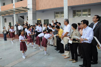 在白塔中學(xué),學(xué)生透過唱歌和跳舞歡迎議員到訪,并向香港市民送上感謝。其后,同學(xué)們又向來自香港的客人致送感恩卡。該校校長何平向議員簡介說,重建后該校將可提供2200個(gè)學(xué)位,較原有的學(xué)位增加超過30%,議員最后更與學(xué)生高唱一曲“感恩的心”。