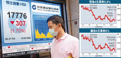 中新網(wǎng)6月19日電 據(jù)香港《文匯報(bào)》報(bào)道,港股連續(xù)第4個(gè)交易日下跌,恒指18日剛開(kāi)市便急挫,失守18000點(diǎn)大關(guān)后,瞬即落至全日最低位17655點(diǎn),連17700點(diǎn)也守不住,午后跌幅雖一度收窄,但臨收市沽壓又再度重現(xiàn),全日收?qǐng)?bào)17776.6點(diǎn),跌307.9點(diǎn),成交額639億元。