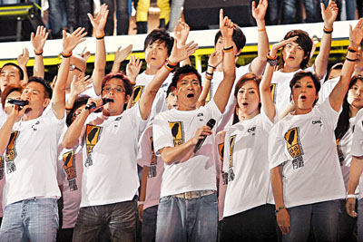 沒(méi)人歡呼,沒(méi)人揮動(dòng)熒光棒,萬(wàn)人聚集在一起,并不是欣賞精彩表演,為的只是告訴臺(tái)灣受臺(tái)風(fēng)吹襲的災(zāi)民,他們?cè)诶Ь持胁⒉还陋?dú);為的只是從心中呼喊一聲:“臺(tái)灣加油!”
