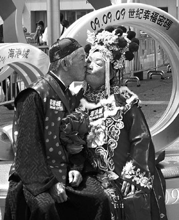 9月8日,六對(duì)夫婦與情侶身穿中西結(jié)婚禮服,一起親吻作愛(ài)的見(jiàn)證。為與天下有情人在09年9月9日(09.09.09)這世紀(jì)一遇的“長(zhǎng)長(zhǎng)久久”日子共度最浪漫時(shí)刻,香港海港城特別在當(dāng)日舉行宣傳活動(dòng)。 中新社發(fā) 譚達(dá)明 攝