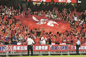 銅鑼灣21日晚紅海涌現(xiàn),不少曾經(jīng)離棄、甚至是從不入場(chǎng)的香港人也被南華激發(fā)熱情,公開發(fā)售的3.8萬張門票在賽前一個(gè)半小時(shí)已告售罄,不少球迷望門興嘆。香港大球場(chǎng)再次紅旗飄揚(yáng),門券收入共199萬港元。