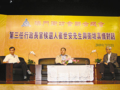 中新網(wǎng)7月13日電 據(jù)香港《文匯報(bào)》報(bào)道,澳門(mén)行政長(zhǎng)官唯一候選人崔世安發(fā)表參選政綱后,隨即到各大社團(tuán)介紹政綱。12日他到澳門(mén)街坊會(huì)聯(lián)合總會(huì),向逾400位街坊推介政綱兼真情對(duì)話。