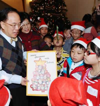 曾蔭權(quán)伉儷24日在禮賓府舉行了一個(gè)圣誕派對(duì),邀請(qǐng)40多位來自深水埗的小學(xué)生,擔(dān)任他的特別嘉賓,一同歡度一個(gè)溫馨愉快的早上。曾蔭權(quán)在博客中透露,自己與小朋友在圣誕樹前大合照,他們又送其一張巨型的圣誕卡,里面全是他們可愛的簽名和祝福,其中一句“祝你長命一點(diǎn)”更是“搶眼”:“小孩的直率和可愛,令我不禁失笑!