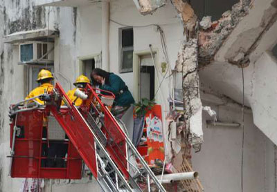 同樣是住在塌樓現(xiàn)場(chǎng)毗鄰危樓的王先生,從事裝修工程,同樣被這驚天場(chǎng)面嚇至目定口呆,事后仍全身發(fā)抖,只能由聞?dòng)嵹s往助援的同事,簡(jiǎn)述逃命經(jīng)過(guò)。