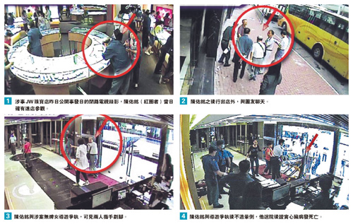 陳佑銘女兒陳怡透露,事發(fā)當(dāng)日(22日)其父被鄭姓導(dǎo)游要求在紅磡JW Jewellery Outlet Limited珠寶店逗留至少2小時(shí)。由于珠寶店大門關(guān)上、樓底矮、人多又沒座位,他感到局促,在店內(nèi)逗留半小時(shí)后到店外透氣,20分鐘后鄭導(dǎo)游要求他回到店內(nèi)。陳怡說:“當(dāng)時(shí)父親表明自己身體不適,又有心臟病,導(dǎo)游反而搶白父親是以病威脅,令老人家非常氣憤!标愑鱼懹诳诮瞧陂g病發(fā)暈倒,送院后證實(shí)死亡。