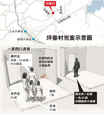 2時許,同事趕到坪輋村譚家時,發(fā)現一名可疑男子在石屋前泥地掘坑有所動作,感覺不妙,于是立即報警。其間疑人發(fā)現行藏敗露,立即跑到附近一間村屋匿藏。警員接報馳至,發(fā)現泥地上有可疑血漬,立即召消防到場協助,消防員將泥土的表層翻開,見2具男女大人,以及2具女童的尸體,由于4名死者已無生命跡象,警方立即封鎖現場,以待7日進一步挖掘調查。
