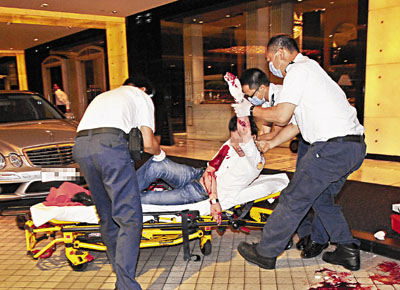 現(xiàn)場(chǎng)為尖東么地道香格里拉酒店門(mén)外,4日凌晨4時(shí)許,“泰龍”偕一男友人在酒店消遣后離開(kāi),行至酒店大門(mén)外分頭各自取回一輛名貴平治房車(chē)和一輛保時(shí)捷跑車(chē),當(dāng)“泰龍”剛走到平治座駕旁,突有2輛車(chē)從前后高速駛至,其中一輛7人車(chē)從酒店行車(chē)通道入口直沖向他,“泰龍”閃避不及被撞至飛彈落地。另一輛私家車(chē)則從通道出口逆線駛?cè),?chē)上跳出3名分持開(kāi)山刀殺手,直撲“泰龍”揮刀狂砍。