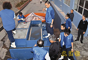 根據(jù)初步檢查結(jié)果,兩尾鱘魚不僅體內(nèi)有炎癥,體外也有不少擦掛傷口。專家會診后制定了“針療+藥物潑灑+水質(zhì)調(diào)整”三路并進(jìn)的治療方案,一方面按照每周兩次的頻率為鱘魚注射抗生素等針劑,同時每周向繁育池中潑灑2至3次調(diào)配好的粉狀藥物,主要功效都是消炎;刈顬榫o張的水質(zhì)檢測,則指派專人負(fù)責(zé)每日抽樣送檢。