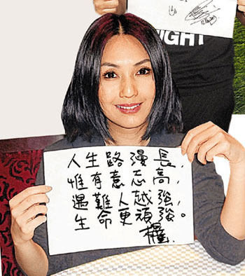 經(jīng)歷一年的恢復(fù),千嬅贊賞政府重建災(zāi)區(qū)的速度很快,像曾受災(zāi)的北川或會再有余震,現(xiàn)移往新地方重建了另一個北川,好讓民眾重新開展新生活,自給自足。千嬅明白這不是一時三刻可以完全復(fù)元過來,重建項目尚要很多年才能真正成功。但令千嬅最欣慰的是:“去年到災(zāi)區(qū)時,城里每個人臉上都是鎖緊愁眉,這次重臨舊地,就看到連小朋友都變得開懷了,臉上有掛上笑容,問他們的志愿,大家異口同聲說想做醫(yī)生將來去幫人,所看到的都是充滿生存的意志,這也就是中國人的特質(zhì),擁有頑強的生命力和團結(jié)一致的精神!”
