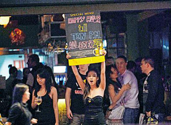 金融海嘯令香港酒吧生意一落千丈,美國(guó)軍艦這次訪港,預(yù)計(jì)會(huì)帶旺尖沙咀、灣仔及銅鑼灣一帶的消費(fèi),特別為區(qū)內(nèi)的酒吧帶來(lái)“及時(shí)雨”。不少酒吧東主得悉有大批美軍抵港,如久旱逢甘露,有酒吧更在門(mén)外掛上美國(guó)國(guó)旗作招徠,而大批衣著性感女郎,比平時(shí)更早“開(kāi)工”,未及黃昏已經(jīng)在街頭向途經(jīng)大兵拋媚眼。