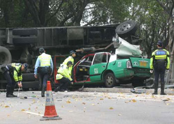 消防員接報趕至現(xiàn)場,發(fā)現(xiàn)被壓扁的的士車廂內躺著6名男子,但已全部氣絕身亡,部分人更被壓至面貌變形,頭顱爆裂。警方事后驗出被告酒精含量是153微克,超標6倍半。