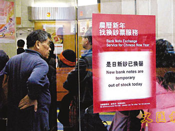 中新網(wǎng)1月14日電 據(jù)香港《文匯報(bào)》報(bào)道,春節(jié)將至,香港市民又要為換新鈔“封利是”張羅。每年春節(jié)前夕,相關(guān)單位都會加印鈔票供市民使用,香港銀行14日起為客戶提供新鈔兌換服務(wù),有新印及回收的新簇舊鈔兩款以供選擇,各面額鈔票的供應(yīng)量會與去年相若,料有3至4億張不同面值的新鈔供應(yīng)。