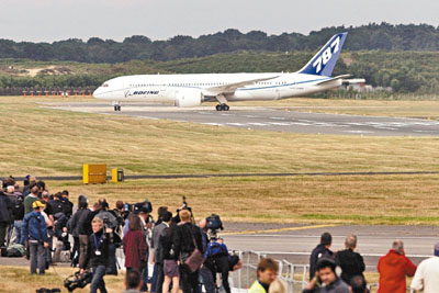 中新網(wǎng)7月19日電 綜合外電報道,倍受矚目的波音"787夢想客機"18日在英國范堡羅航空展首次亮相。這架美國制造的新型客機當(dāng)天降落在英國,完成首次在美國以外的飛行之旅。