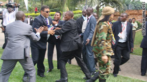 峰會(huì)第二天,類似的場(chǎng)景再次發(fā)生,只不過(guò)這次是總統(tǒng)衛(wèi)隊(duì)試圖護(hù)送卡扎菲及其安全團(tuán)隊(duì)進(jìn)入主會(huì)場(chǎng)。當(dāng)時(shí)其他國(guó)家首腦已經(jīng)進(jìn)入另外一個(gè)房間。當(dāng)烏干達(dá)安全人員要接手護(hù)送卡扎菲進(jìn)入時(shí),與總統(tǒng)衛(wèi)隊(duì)發(fā)生了沖突。