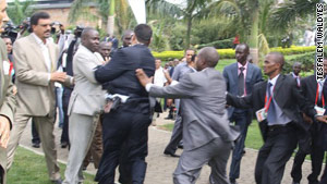 峰會(huì)第一天,利比亞總統(tǒng)衛(wèi)隊(duì)即與烏干達(dá)安全人員發(fā)生了拳腳沖突。根據(jù)CNN記者薩曼森納塔爾的描述,當(dāng)時(shí)正要舉行峰會(huì)開幕式。按照規(guī)定,只有國(guó)家首腦被允許進(jìn)入會(huì)場(chǎng)。利比亞總統(tǒng)衛(wèi)隊(duì)試圖護(hù)送卡扎菲通過(guò)入口,遂與烏干達(dá)安全人員發(fā)生爭(zhēng)論,隨后升級(jí)為肢體沖突,但是雙方?jīng)]有動(dòng)槍。