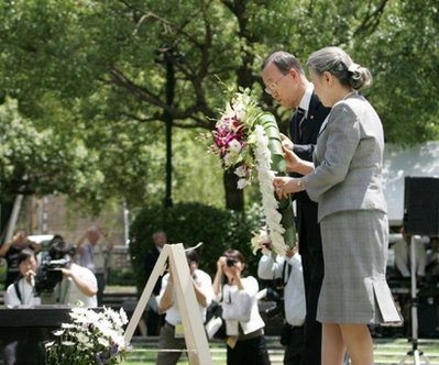 潘基文還前往爆炸中心地公園,向“原子彈落下中心地碑”獻(xiàn)花,然后向全世界宣布自己決心作為聯(lián)合國秘書長全力創(chuàng)建“無核武世界”。此外,潘基文還向附近的“長崎核爆朝鮮死難者追悼碑”獻(xiàn)了花。