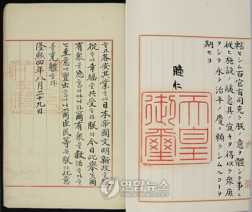 韓聯(lián)社10日通過首爾大學(xué)名譽教授李泰鎮(zhèn)掌握到日方韓日合并條約詔書照片,圖中可以看到,1910年8月29日日本天皇公布韓日合并的詔書上印有天皇御璽,署名“睦仁”。