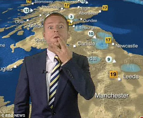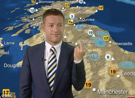 英國廣播公司天氣節(jié)目主播日前在節(jié)目中做出令人大跌眼鏡的舉動,他當眾朝新聞主播豎中指引發(fā)熱議。