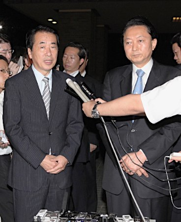 中新網(wǎng)8月31日電 據(jù)日本新聞網(wǎng)報(bào)道,為避免民主黨分裂,日本首相菅直人30日晚與前首相鳩山再度舉行了會(huì)談,就民主黨黨代表選舉事宜,準(zhǔn)備聽取黨內(nèi)“大佬”小澤一郎的意見,以避免出現(xiàn)“兩虎相斗”的局面。