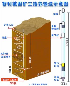 1 恢復(fù)身體營養(yǎng)。衛(wèi)生部長馬納利奇說,營救“預(yù)備計劃”的第一步是讓受困礦工“恢復(fù)營養(yǎng)”,接受專業(yè)治療。智利政府將高能量的葡萄糖凝膠和牛奶罐裝液體通過已經(jīng)挖好的一個長達(dá)數(shù)百米的巷道輸送到井下。