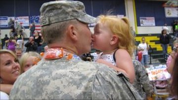 士兵杰森•艾夫舍德盡情享受著與妻子和孩子團聚的溫情。他說,過去的1年真是無比漫長的1年。妻子考特尼則無法抑制住淚水,她說:“我覺得這是種解脫,不用每天擔(dān)心他的安全,他可以每天晚上回到家里。”