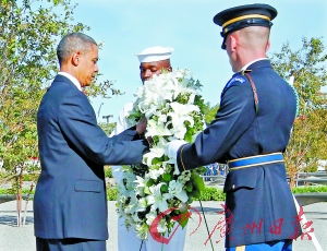 11日,奧巴馬在五角大樓為遇難者獻(xiàn)花圈。