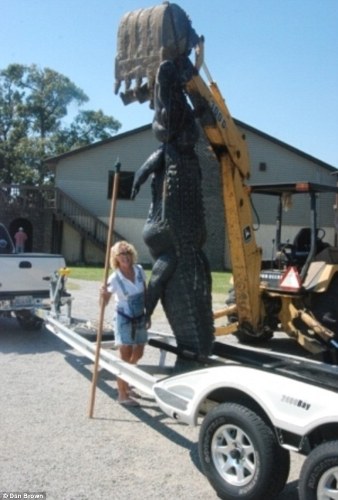 在南卡羅來納州摩爾特里湖中,48歲的瑪拉·克里斯蒂安與這條巨大無比的可怕生物爭(zhēng)斗了兩個(gè)小時(shí)。22毫米口徑的獵槍根本無法制服它,瑪拉就用鋒利的尖刀切斷了野獸的脊柱。最終,她終于可以在起吊機(jī)前細(xì)細(xì)打量這條令人難以置信的鱷魚。