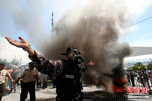 當(dāng)總統(tǒng)科雷亞30日趕赴基多一處被占領(lǐng)的警察營地試圖平息騷亂時,遭到參與騷亂的警察的催淚瓦斯襲擊。現(xiàn)場視頻顯示,盡管保鏢給科雷亞戴上了防毒面具,但他仍非常不適。腿部也受輕傷的科雷亞隨后被送往附近一家醫(yī)院接受治療。